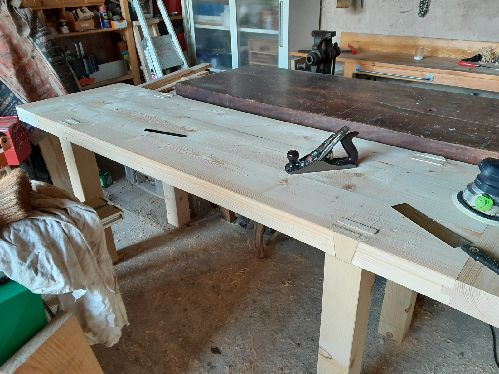 J’ai réalisé un prototype de table de ferme en utilisant un mode d’assemblage des pieds qui peut surprendre. La beauté de l’exercice repose dans l’assemblage des pieds. En effet, à première vue cela semble impossible de faire rentrer le pied de table dans le plateau. Cet assemblage était utilisé pour le pied d’un établi qui reçoit la presse verticale.